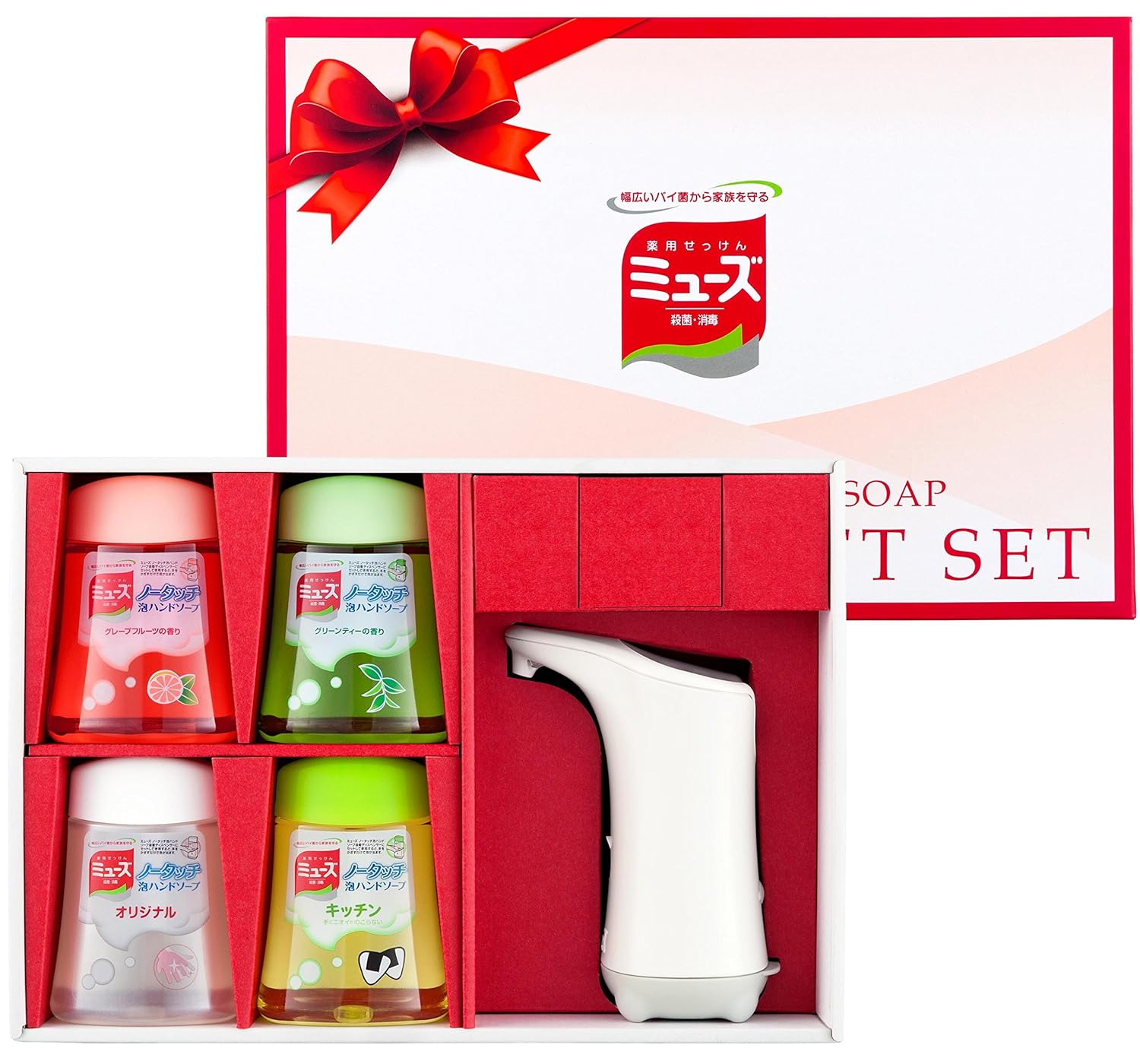![]() | ミューズ ノータッチ泡ハンドソープ ギフトセット 本体+替250mlx4個(4種) ・ハンドソープが泡状になって出てくる自動ディスペンサーと4種類の詰替が入っています。ノズルの下に手をかざすとセンサーが反応し、手洗い約1回分(約1ml)が出てきます。ポンプを押す必要がないため衛生的で、いつでも簡単に手が洗えます。幅広いバイ菌をしっかり殺菌・消毒するとともに、3つの保湿成分が手のかさつきを予防。高級な箱デザインなので御中元 、御歳暮、 御挨拶、 敬老 御祝、 誕生日、 新築 結婚、 お返し ギフト 、母の日などにピッタリ。[製品詳細] |