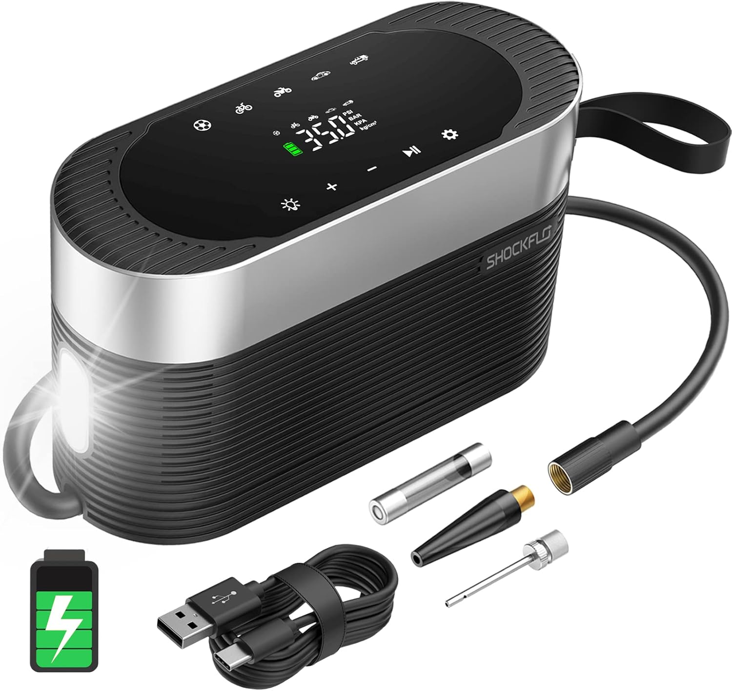 ![]() | ShockFlo 電動 空気入れ エアコンプレッサー電動 税込*,***円 [送料無料 ・7800mAhの大容量電池搭載で効率アップ!一度のフル充電で車のタイヤ5本分に空気を充填することができます。米式バルブには付属のアタッチメントを交換して、車、自動車、バイク、自転車、トラ ック、ロードバイク、浮き輪、ボールなどに対応出来ます。様々なものに簡単・便利・お手軽に空気を入れることができます!Type-C充電なので、どこでも便利に充電することができます。 |